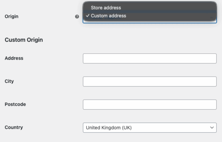 If you want to avoid calculating shipping costs based on store location (entered in WooCommerce settings), you can provide custom shipping origin. When you select Custom address from Origin field, you will be able to enter the address for the distance calculations.