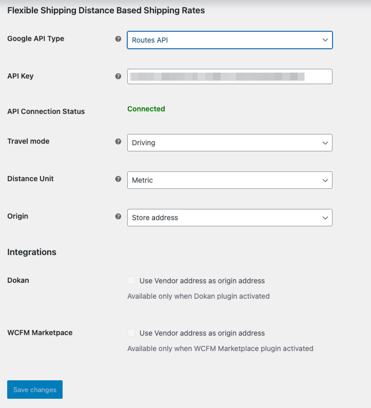 If you have a Dokan or WCFM activated you can tick appropriate checkbox. After ticking checkbox of Dokan or WCFM, address of the vendor from Dokan or WCFM instead of Origin store address is used by the Distance Based Shipping Rates plugin.