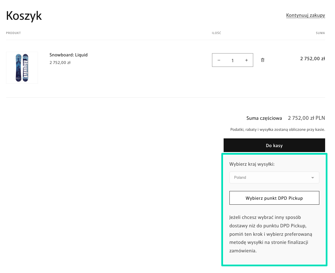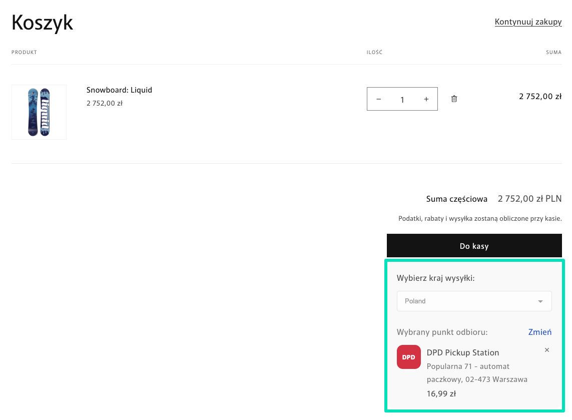 Z tego właśnie powodu, jako pewne obejście ograniczeń Shopify i alternatywne rozwiązanie, wersja aplikacji dla sklepów bez CCS i dostępu do Carrier-Service API umożliwia dodanie widgetu wyboru punktów DPD Pickup na stronie Koszyka zamiast w checkoucie, pozwalając klientom wybrać preferowany punkt z mapy.