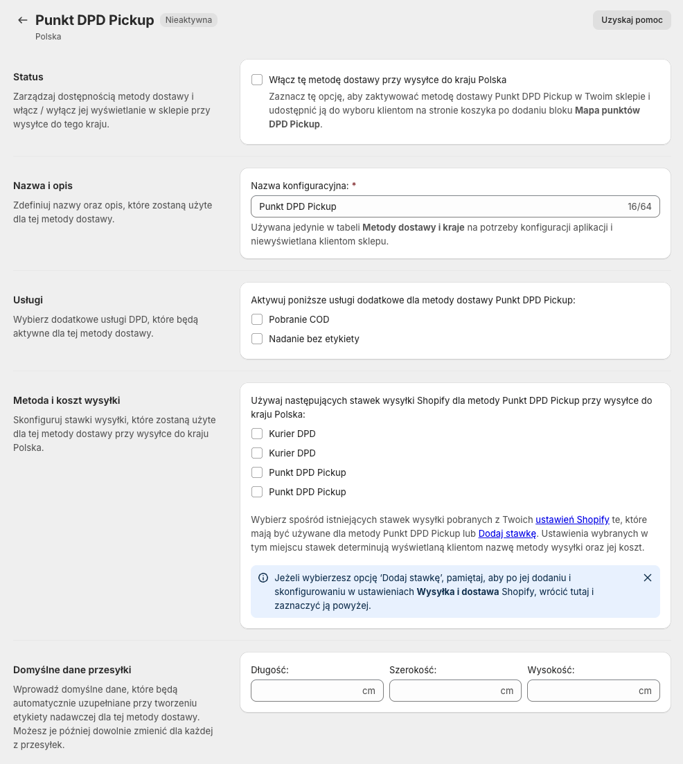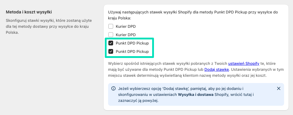 Używaj następujących stawek wysyłki Shopify dla metody Punkt DPD Pickup przy wysyłce do kraju {nazwa_kraju}: – wybierz spośród istniejących stawek wysyłki, pobranych z Twoich ustawień Wysyłka i dostawa Shopify te, których ma używać ta metoda dostawy DPD. Ustawienia wybranych w tym miejscu stawek determinują wyświetlaną klientom nazwę metody wysyłki raz jej koszt.
