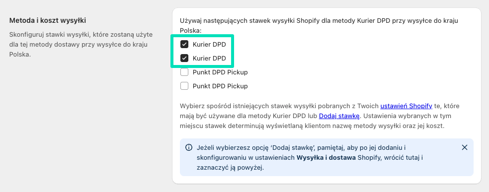 Używaj następujących stawek wysyłki Shopify dla metody Kurier DPD przy wysyłce do kraju {nazwa_kraju}: – wybierz spośród istniejących stawek wysyłki, pobranych z Twoich ustawień Wysyłka i dostawa Shopify te, których ma używać ta metoda dostawy DPD. Ustawienia wybranych w tym miejscu stawek determinują wyświetlaną klientom nazwę metody wysyłki raz jej koszt.