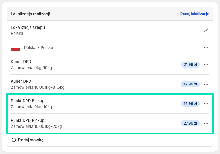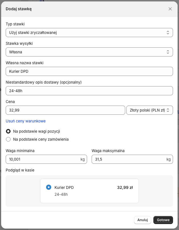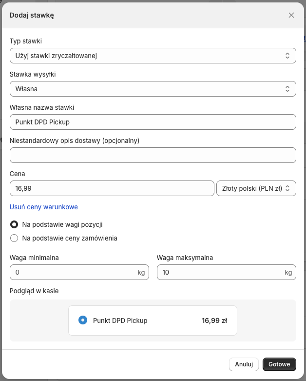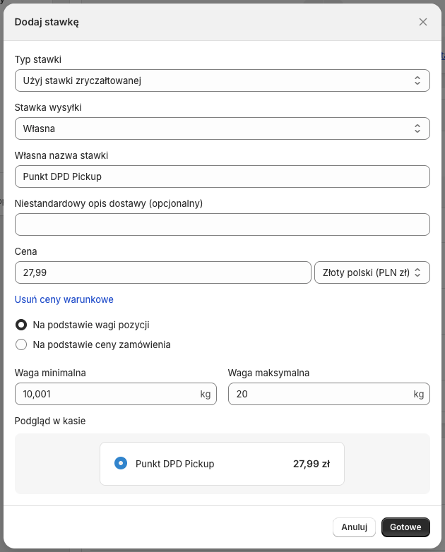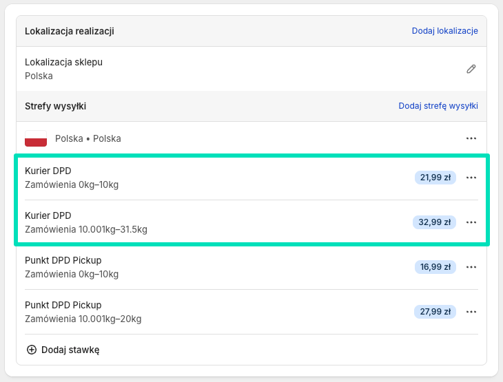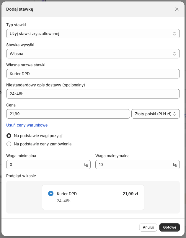 Jeżeli chcesz, aby koszt wysyłki metodami dostawy DPD różnił się, np. w zależności od wagi lub wartości zamówienia, możesz w tym miejscu dodać wiele stawek dla różnych zakresów wagi/ceny.