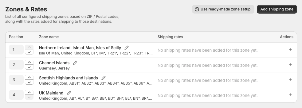 Once your custom shipping zones have been configured, your Zones & Rates screen should look similar to what you see here — with your shipping zones listed in the Zone name column on the left, and no shipping rates added yet on the right side of the table: