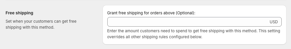 Grant free shipping for orders above – enter the minimum order value threshold that grants your customers free shipping once exceeded.