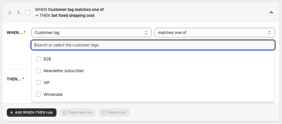 You can add as many shipping cost calculation rules for a given shipping method as you need. To do this, simply click the + Add WHEN-THEN rule button at the bottom of the table: