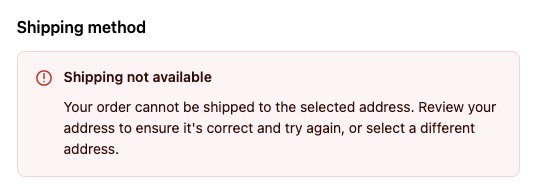 The default Shopify’s Shipping not available notice shown at checkout will be updated according to the changes you’ve made: